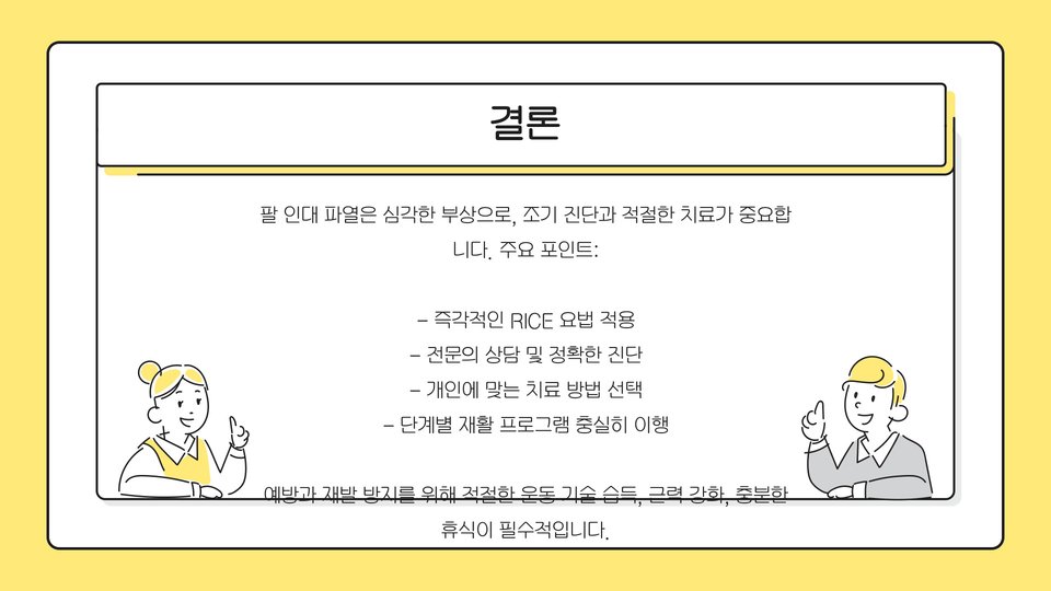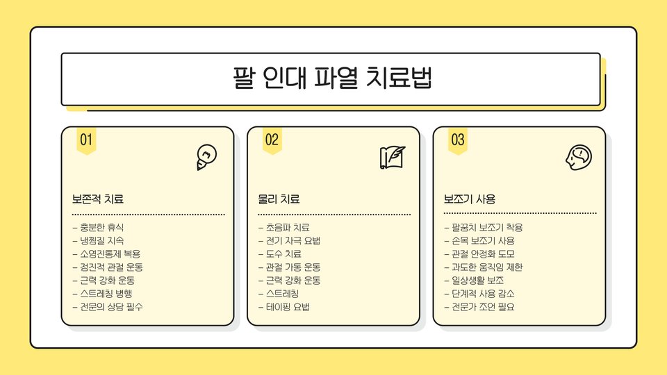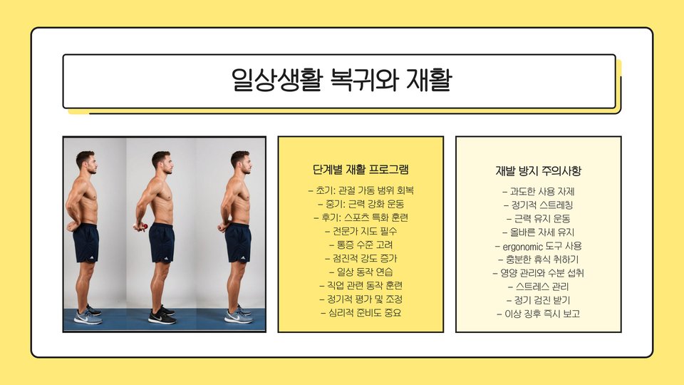 마지막으로, 점차적으로 재활 운동을 시작하는 것이 중요합니다. 전문가의 지도 아래에서 부상의 회복을 돕는 운동을 수행해야 하며, 이를 통해 점진적으로 팔의 기능을 회복할 수 있습니다. 전문가의 지도를 받는 것이 회복의 핵심입니다.