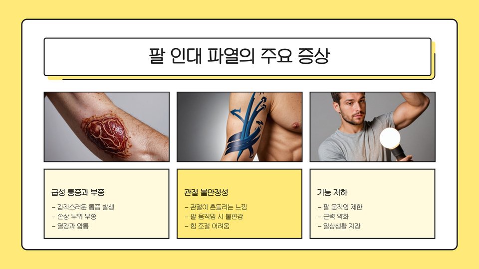 중요 팁: 팔 인대 파열은 적절한 대처가 필요합니다. 부상 후 즉시 응급처치를 하고, 증상이 심할 경우 전문의를 찾아 진료를 받는 것이 가장 좋습니다.