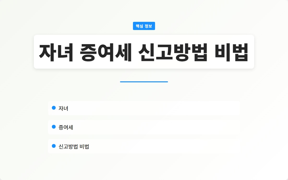 자녀 증여세란 부모가 자녀에게 재산을 증여할 때 부담하는 세금으로, 증여받은 금액에서 면제한도를 제외한 금액에 대해 세율이 적용됩니다. 2024년부터 새로운 세법이 시행되며, 자녀에게 자산을 물려줄 계획이 있는 분들은 반드시 확인해야 합니다. 이 글을 통해 자녀 증여세 신고방법을 자세히 알아보겠습니다.