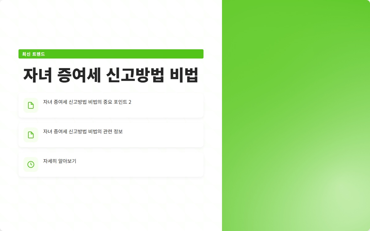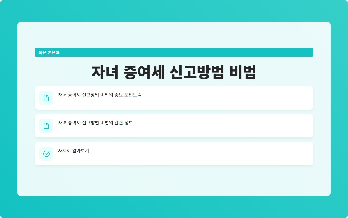 자녀에게 자산을 증여하는 것은 중요한 결정입니다. 자녀 증여세 신고방법을 정확히 이해하고 계획적으로 접근한다면, 증여세 부담을 최소화할 수 있습니다. 여러분의 자산을 효과적으로 물려주기 위해 필요한 정보를 충분히 활용하시기 바랍니다.