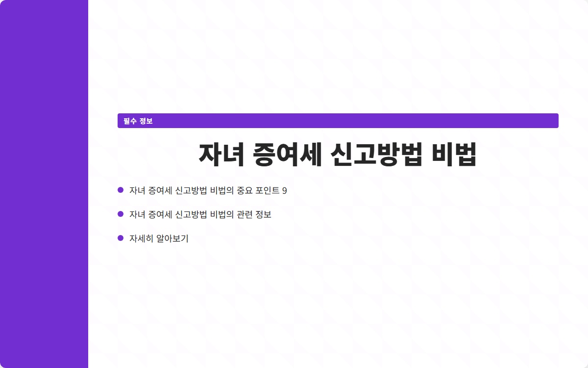 자녀에게 자산을 증여하는 것은 중요한 결정입니다. 자녀 증여세 신고방법을 정확히 이해하고 계획적으로 접근한다면, 증여세 부담을 최소화할 수 있습니다. 여러분의 자산을 효과적으로 물려주기 위해 필요한 정보를 충분히 활용하시기 바랍니다.