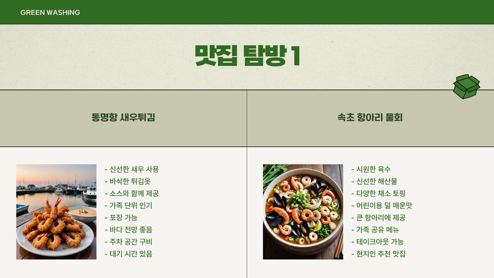 속초의 음식점 중에서는 아이들의 입맛에 맞춰 다양한 메뉴를 제공하는 식당들이 많습니다. 다양한 해산물 요리뿐만 아니라, 아이들이 선호하는 치킨이나 피자도 맛볼 수 있어 선택의 폭이 넓습니다. 가족 단위 여행객들을 위한 배려가 돋보이는 음식점들이 많습니다.