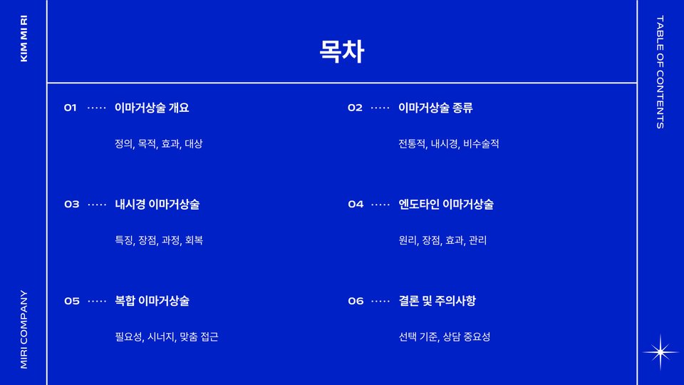 이마거상은 많은 이들에게 젊고 탄력 있는 피부를 선사하는 효과적인 시술입니다. 각기 다른 방법들이 존재하므로, 자신의 피부 상태와 원하는 결과에 맞춰 적절한 방법을 선택하는 것이 중요합니다. 전문가와의 상담을 통해 최선의 선택을 하시길 바랍니다.