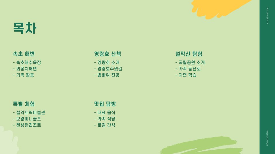 이번 포스트에서는 가족과 함께 속초에서 즐길 수 있는 다양한 여행지와 활동들을 소개했습니다. 각각의 장소는 아이와의 소중한 추억을 남길 수 있는 곳들입니다. 안전하고 즐거운 여행을 위해 각각의 코스를 계획해보세요. 행복한 여행 되세요!