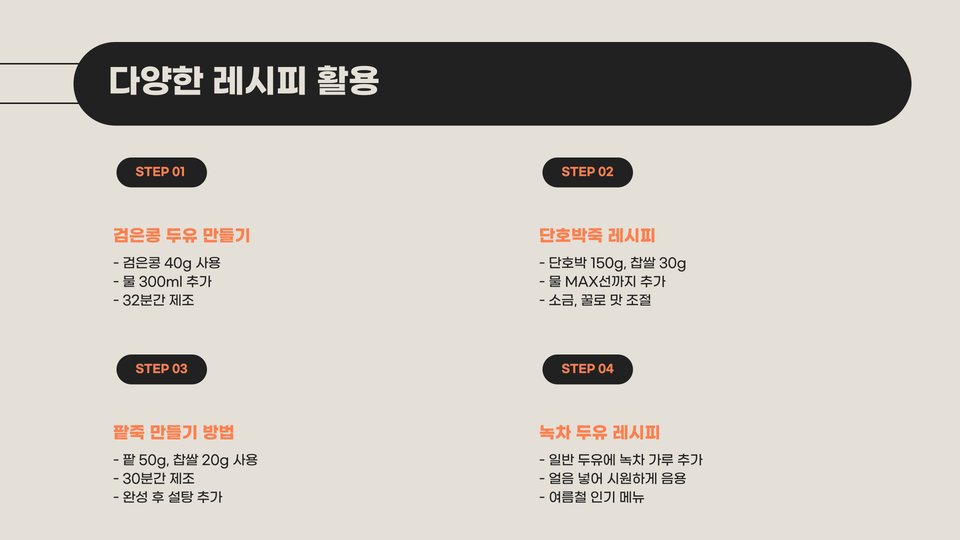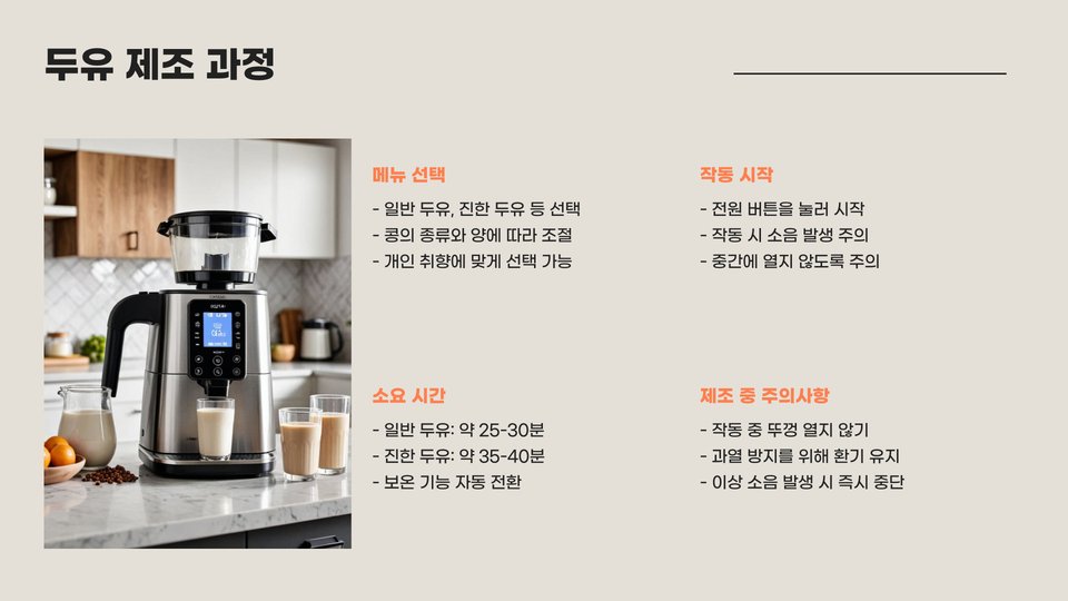 본 기기는 특히 자연 재료만을 사용하여 두유를 제조할 수 있다는 점에서 큰 장점이 있습니다. 이제 두유를 만들기 위해 비싼 재료를 구입할 필요가 없으며, 자신이 원하는 맛과 농도로 직접 조절할 수 있는 자유를 제공합니다. 이를 통해 가족의 건강을 지키는 동시에 비용 절감에도 효과적입니다.