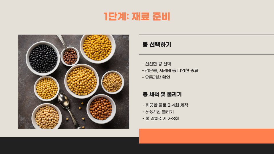 대두는 최소한 6-8시간 정도 불려야 하며, 이 과정이 두유의 부드러운 질감과 깊은 맛을 만드는 데 매우 중요합니다. 불린 대두는 체에 걸러 깨끗이 헹궈서 사용해야 하며, 이때 물기를 완전히 제거하는 것이 좋습니다. 이렇게 준비한 재료는 후속 과정을 더욱 매끄럽게 만들어 줍니다.