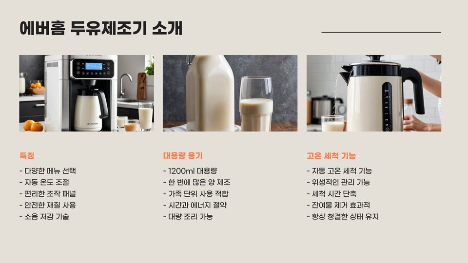 에버홈 두유제조기는 집에서도 간편하게 두유를 만들 수 있는 기기로, 신선한 두유를 즐기고 싶은 사람에게 특히 유용합니다. 이 기기는 다양한 종류의 두유를 제조할 수 있으며, 건강을 중시하는 소비자들 사이에서 큰 인기를 끌고 있습니다. 사용이 간편하고, 세척이 용이하여 바쁜 현대인들에게 적합한 제품입니다.